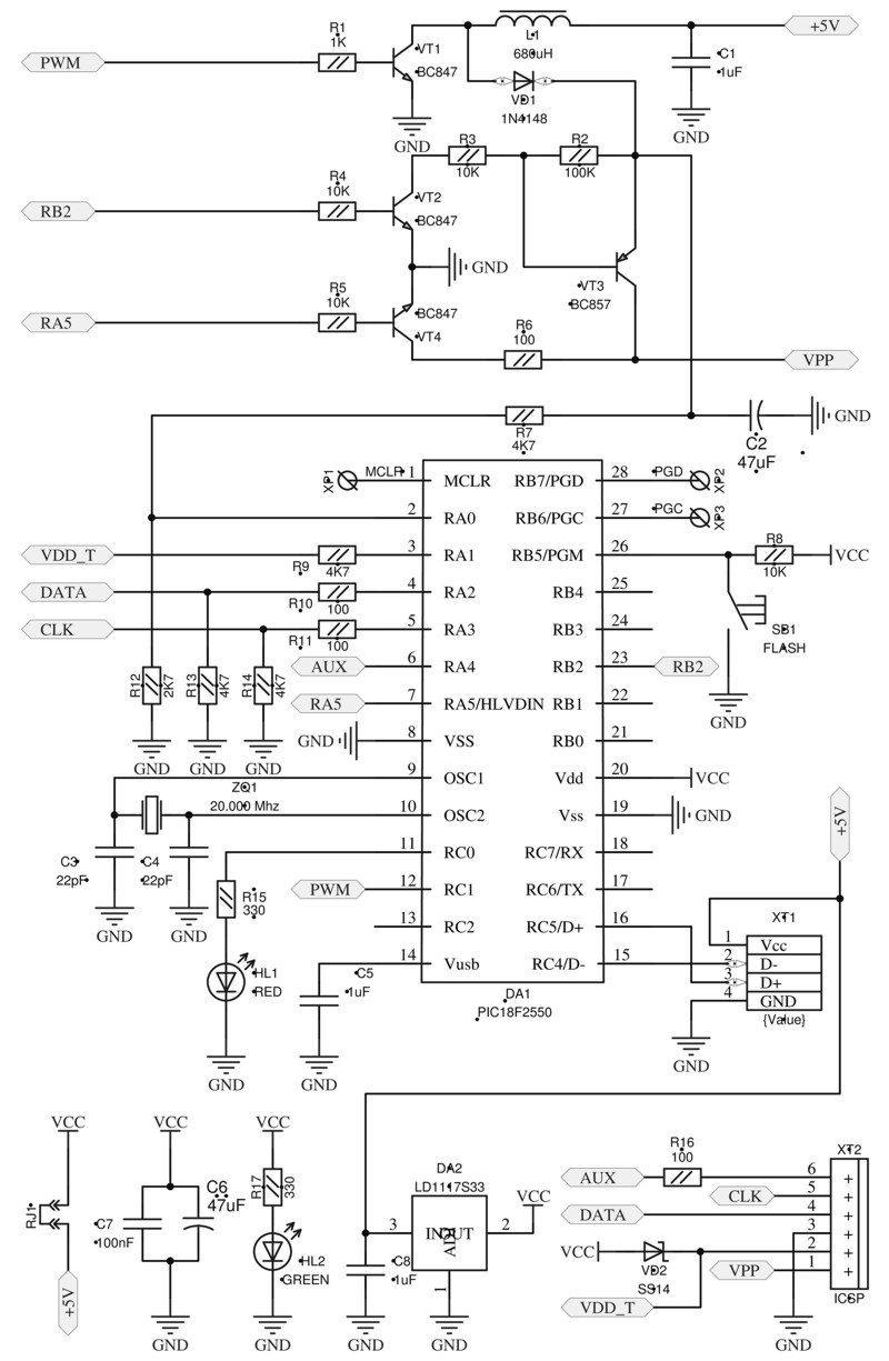 - Возможность питания отлаживаемого устройства от USB программатора PICKIT 2