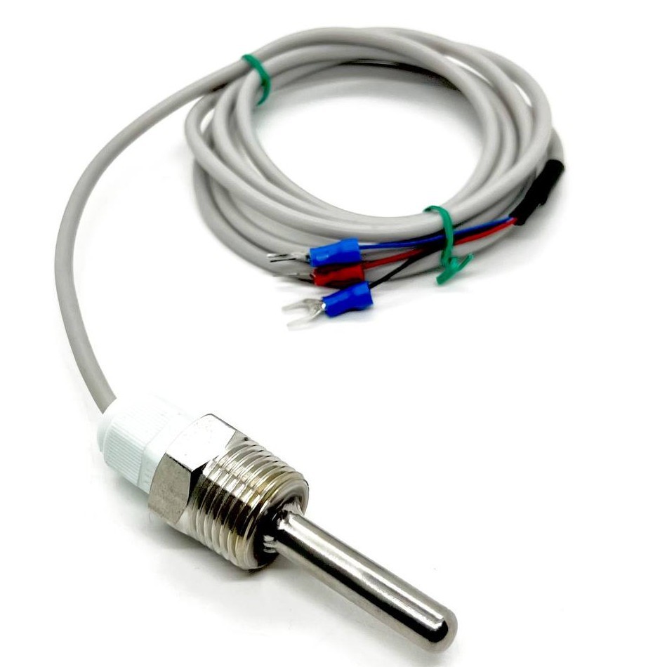 Фото может отличаться от реального вида предмета, но это не влияет на основные характеристики изделия | Датчик температуры аналоговый (термодатчик) PT1000-BSP-G1/2-37mm Датчик (зонд) на базе аналогового датчика температуры PT1000, Нержавеющая сталь, Длина кабеля 1.5 метра (+/-10 см). Резьба G1/2. Длина гильзы - 37 мм