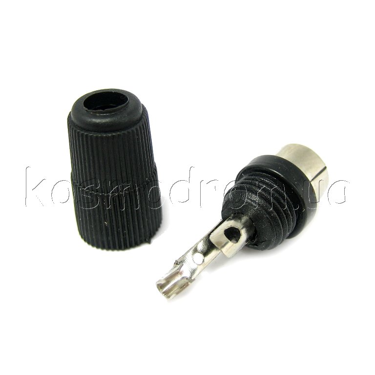 RCA разъем (тюльпан), мама, пластиковый корпус, черный, контакты никелированные. Диам. кабеля 4,7 мм.
