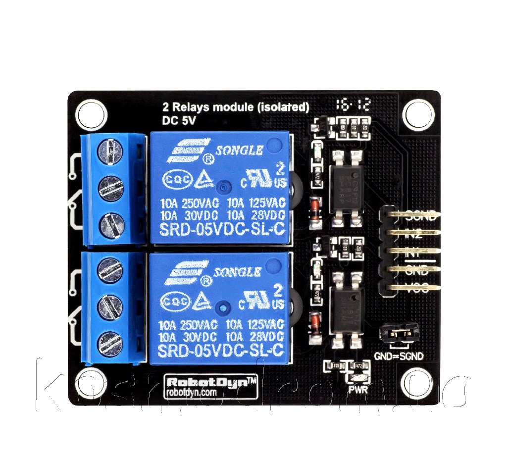 Двухканальный релейный модуль используется для управления различными приборами с входным током до 10А. модуль представляет собой два реле, с 5 вольтовым управлением, гальванически развязанным от реле с помощью оптопары. Каждое реле рассчитано до 230В 10А переменного тока или 30 В 10 А постоянного тока.