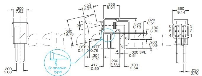 Переключатель: тумблер, Конфиг.контактов: SP3T, 3А/125В. 1A/250В, выводы на печатную плату, угловые, 3 фиксированных положения. ON-OFF-ON. Контактов: 3