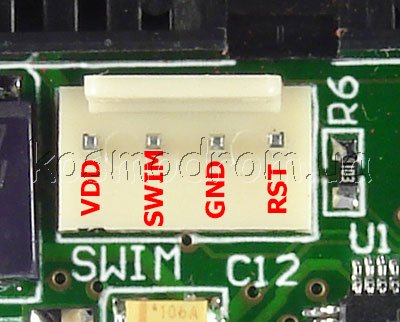 - Стандартный 4-контактный SWIM разъем. Расположение контактов в