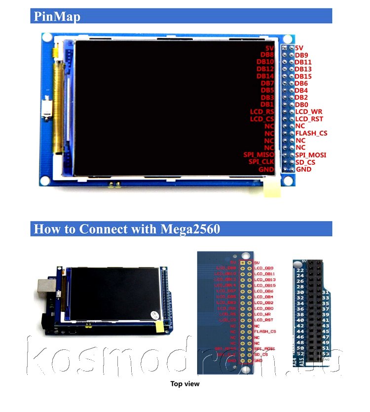 Подходит библиотека UTFT. На плате дисплея расположен разъем подключения SD-Card для хранения данных. Соединяется непосредственно с платой, без дополнительных переходников.