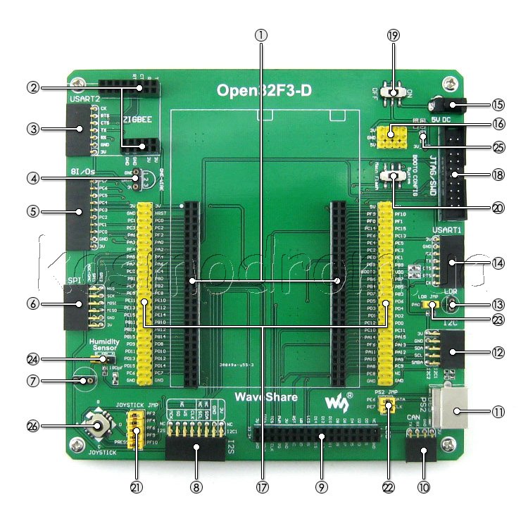 1) STM32F3DISCOVERY socket: for easily connecting the