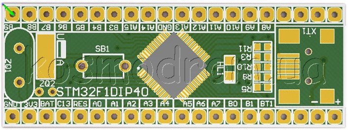 Для освоения данной линейки контроллеров фирмы ST инженер может столкнуться с проблемой изготовления печатной платы и монтажа LQFP корпуса с шагом выводов всего 0.5мм. Модуль STM32F103-DIP40 освобождает разработчика от этих неудобств, т.к. имеет в своей схеме все компоненты, необходимые для нормального функционирования микроконтроллера STM32F103C8. Основным преимуществом является то, что данный модуль с легкостью можно установить в обычную панель для микросхем DIP40 или на макетную плату.