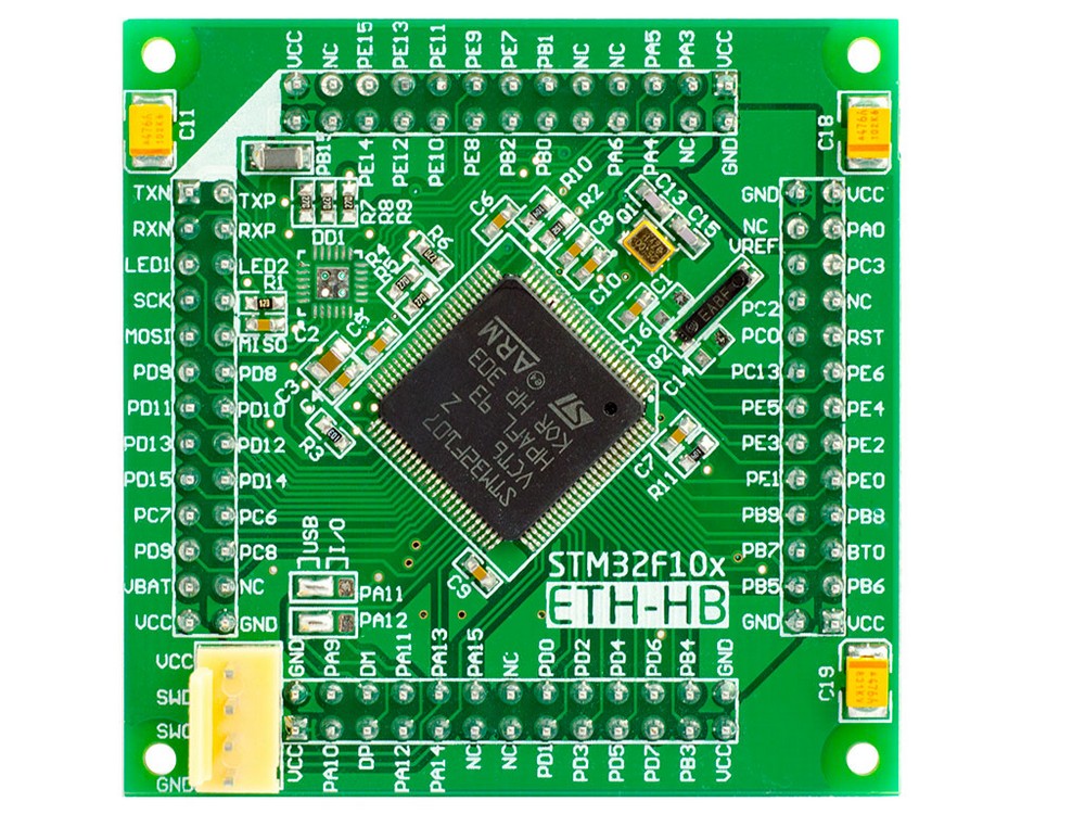 STM32F10x ETH-HB-LITE содержит микроконтроллер STM32F107VCT6 с богатым набором