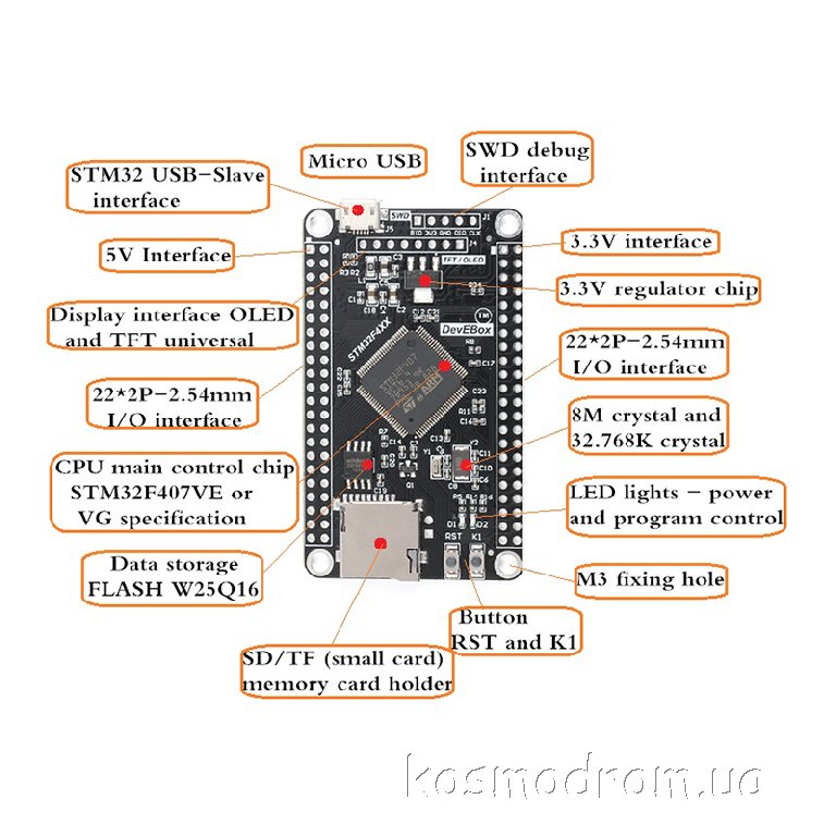 Отладочная плата на основе микроконтроллера STM32F407VET6.  Микроконтроллер STM32F407VET6, основанный на 32-разрядном ядре ARM Cortex-M4, с 512 кБайт Flash памяти, 192 кБайт ОЗУ, максимальной тактовой частотой ядра 168МГц и производительностью до 210 DMIPS в корпусе LQFP100