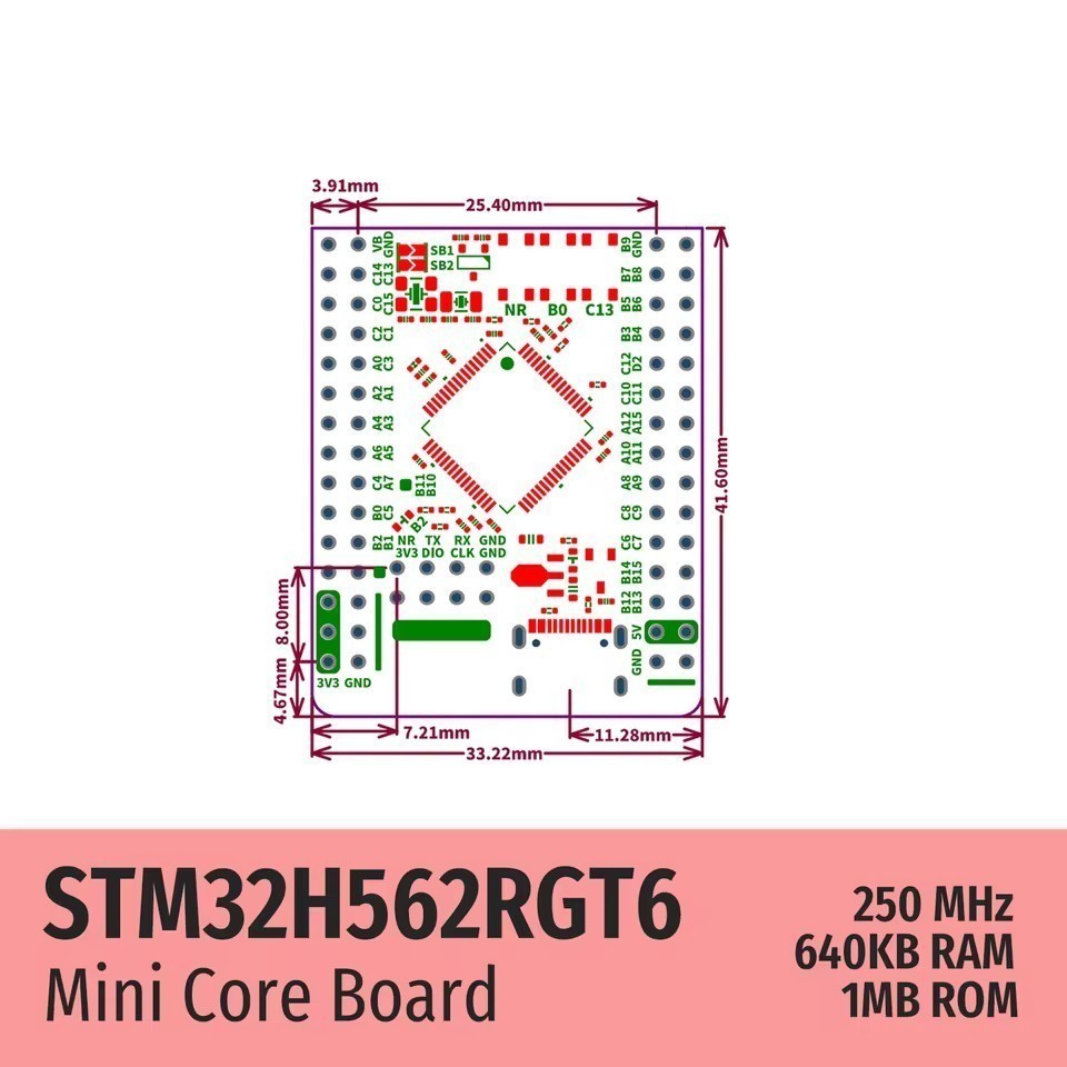 Плата STM32H562RGT6 Mini Core Board — это мощная и компактная отладочная плата на базе микроконтроллера STM32H562RGT6, входящего в высокопроизводительную серию STM32H5 от STMicroelectronics. Эта серия предназначена для приложений с высокими требованиями к вычислениям, безопасности и энергоэффективности.