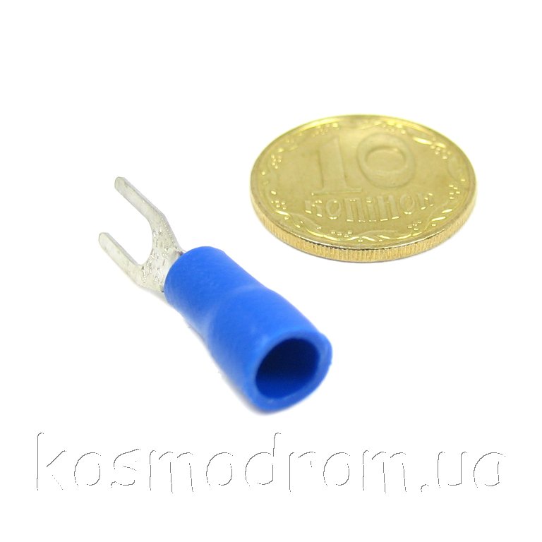 Наконечник кабельный вилочный (клемма) с изоляцией. Диам. отверстия под болт 3,2 мм, провод 0.5-1.5 мм. Цвет изолятора: синий