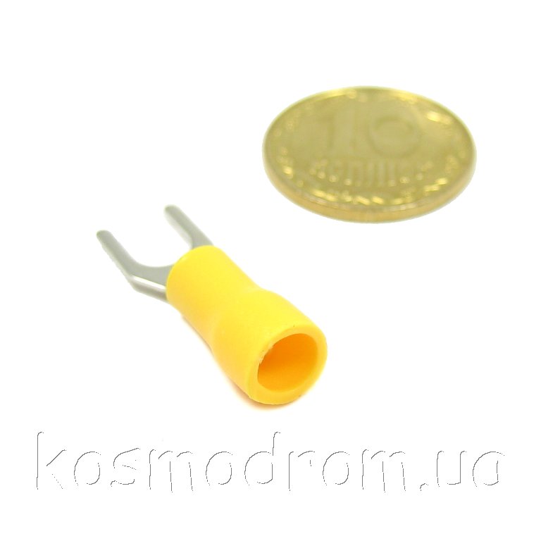 Наконечник кабельный вилочный (клемма) с изоляцией. Диам. отверстия под болт 4,3 мм, провод 0.5-1.5 мм. Цвет изолятора: желтый