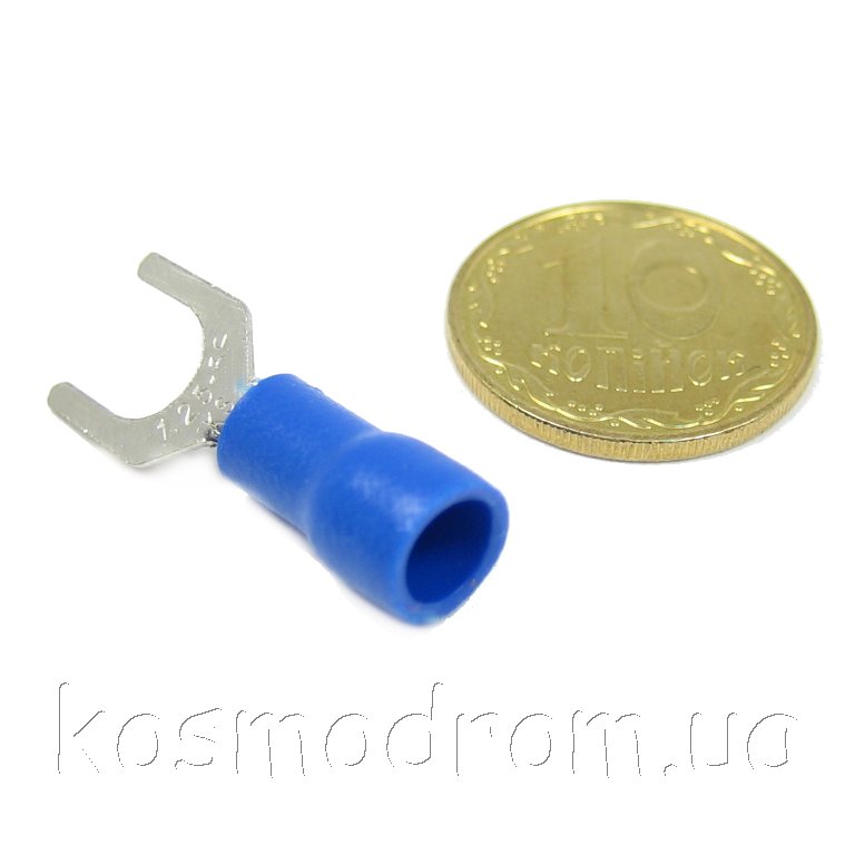 Наконечник кабельный вилочный (клемма) с изоляцией. Диам. отверстия под болт 5,3 мм, провод 0.5-1.5 мм. Цвет изолятора: синий