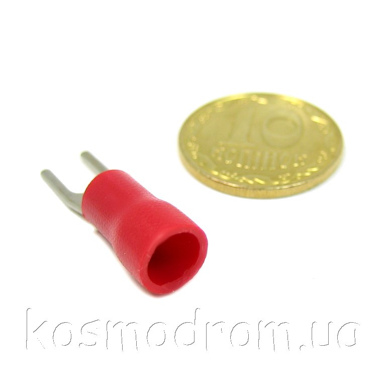 Наконечник кабельный вилочный (клемма) с изоляцией. Диам. отверстия под болт 3,2 мм, провод 1.5-2.5 мм. Цвет изолятора: красный