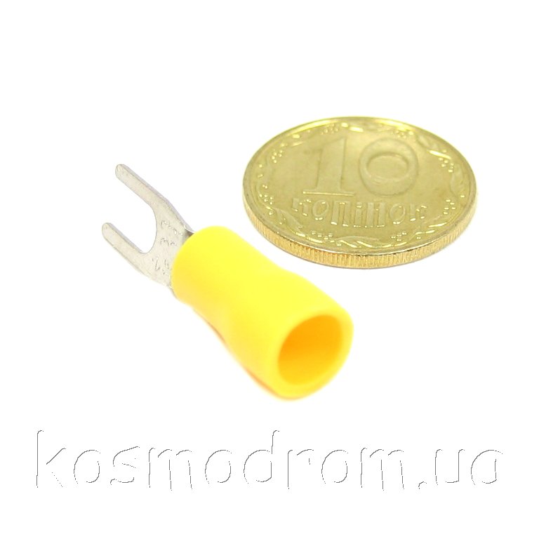 Наконечник кабельный вилочный (клемма) с изоляцией. Диам. отверстия под болт 3,2 мм, провод 1.5-2.5 мм. Цвет изолятора: желтый
