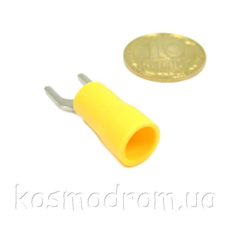 Наконечник кабельный вилочный (клемма) с изоляцией. Диам. отверстия под болт 5,3 мм, провод 2.5-4 мм. Цвет изолятора: желтый