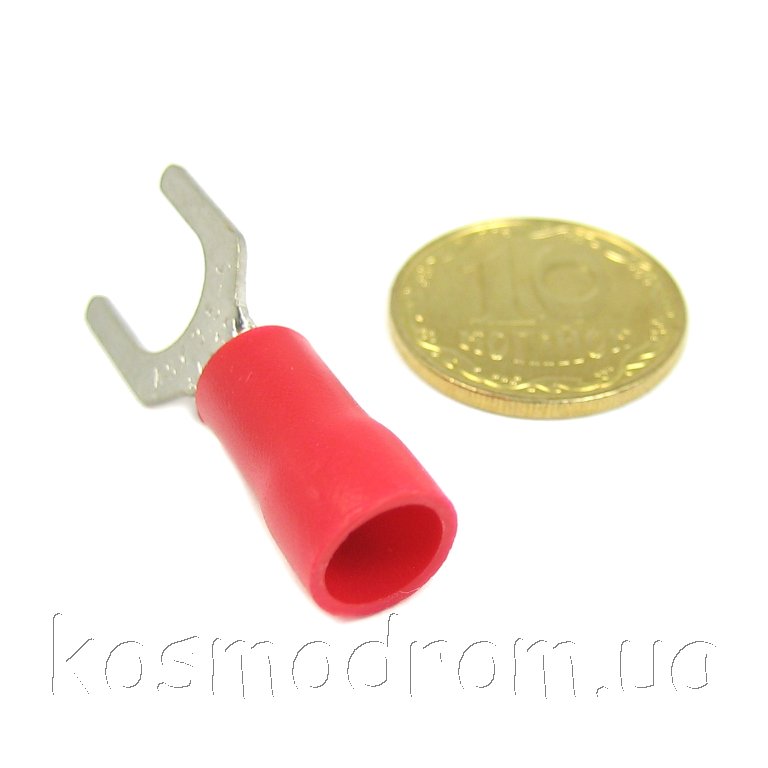 Наконечник кабельный вилочный (клемма) с изоляцией. Диам. отверстия под болт 6,5 мм, провод 2.5-4 мм. Цвет изолятора: красный