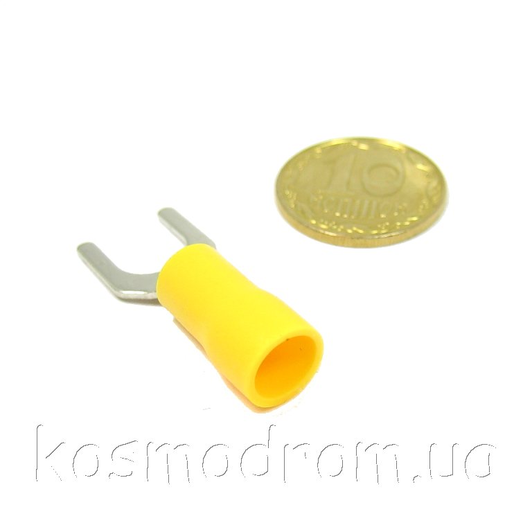 Наконечник кабельный вилочный (клемма) с изоляцией. Диам. отверстия под болт 6,5 мм, провод 2.5-4 мм. Цвет изолятора: желтый