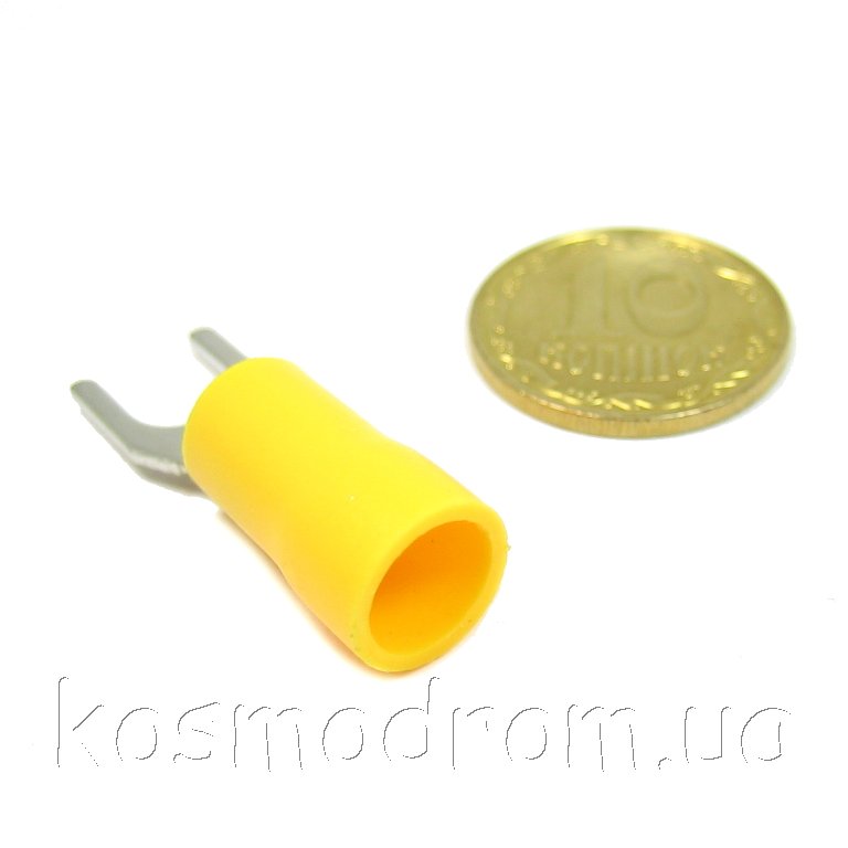 Наконечник кабельный вилочный (клемма) с изоляцией. Диам. отверстия под болт 5,3 мм, провод 4-6 мм. Цвет изолятора: желтый