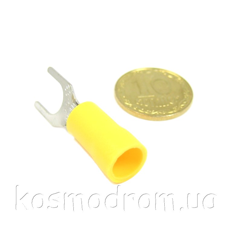 Наконечник кабельный вилочный (клемма) с изоляцией. Диам. отверстия под болт 6,5 мм, провод 4-6 мм. Цвет изолятора: желтый