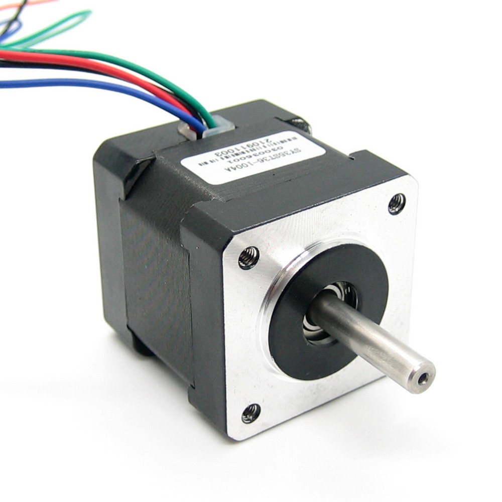 Двухфазный шаговый двигатель: Угол шага - 1.8 гр. Ток обмотки - 1 А. Момент удержания - 1,4 кг/см. Вес - 0,18 Кг. Габариты - 35.2 х 35.2 х 36 мм. Диаметр вала - 5 мм