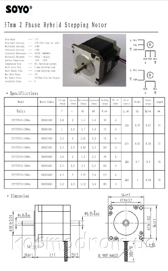 Фото может отличаться от реального вида предмета, но это не влияет на основные характеристики изделия | Шаговый двигатель SY57STH76-2804A Угол шага - 1.8 гр. Ток обмотки - 2.8 А. Сопротивление обмотки - 1.13 Ом. Момент удержания - 18.9 Кг.см. Вес - 1.2 Кг. Габариты - 56.4 х 56.4 х 76 мм. Диаметр вала - 6.35 мм