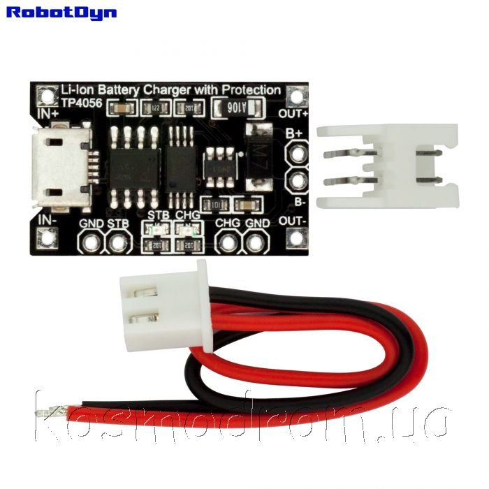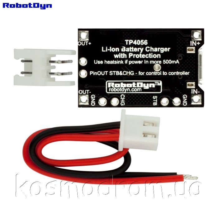 Модуль представляет собой адаптер для зарядки литий ионных и литий полимерных батарей. Это очень маленькое и удобное зарядное устройство для 1s батарей. На плате имеется один красный и один зеленый светодиода. Во время зарядки горит красный, когда зарядка окончена загорается зеленый. Модуль подключается через кабель микро USB или через контакты + и GND. Максимальный ток заряда 1А.