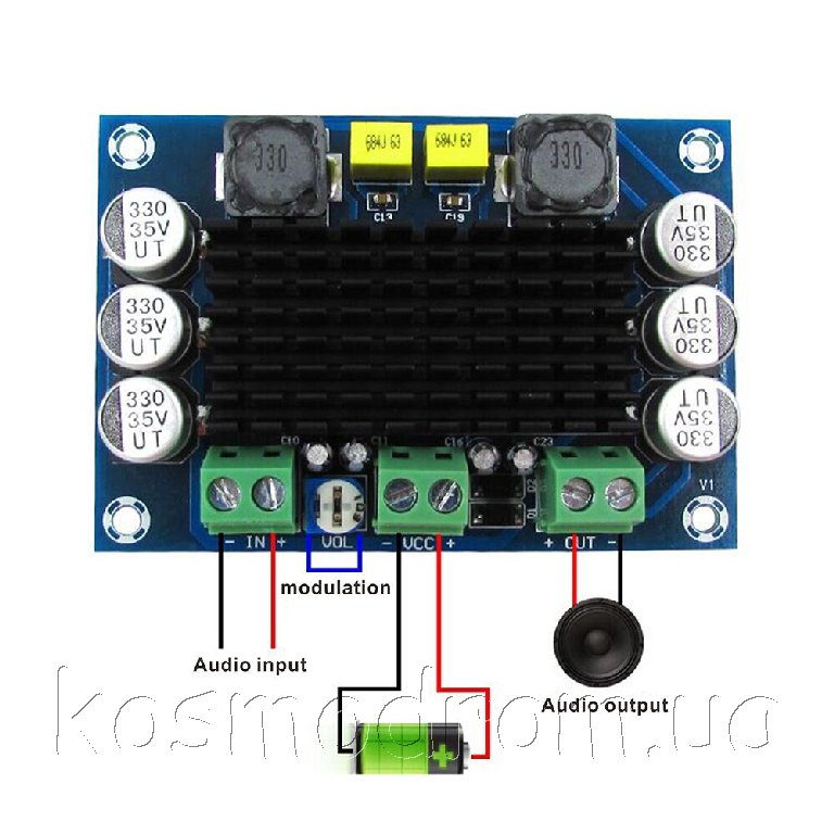Модуль построен на базе звуковой микросхемы D-класса. На плате усилителя установлен потенциометр, который работает как регулятор громкости. Питание 12 - 26 В. Широкий диапазон сопротивлений позволяет работать с различными динамиками.