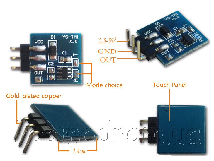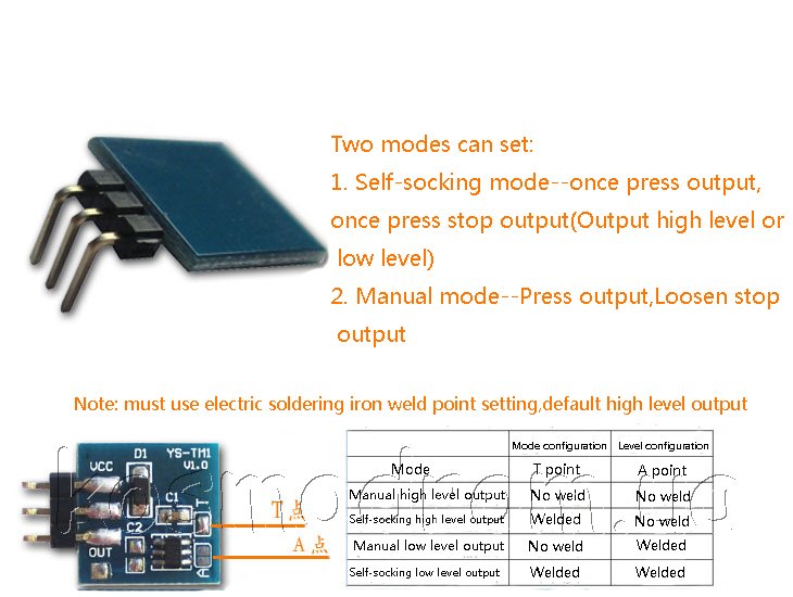Сенсорный модуль ёмкостного типа, модуль основан на регистрации касания к IC TTP223. При нормальных условиях на выходе низкий уровень. Если к модулю не касаться в течении 12 секунд, модуль переходит в режим низкого энергопотребления.