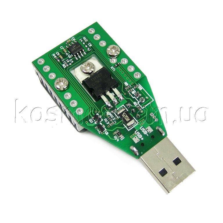 Устройство для подачи регулируемой нагрузки к подключаемым устройствам по USB разъему. Регулировка производится с помощью потенциометра на плате. При подключении устройства к USB тестеру Вы можете проверить реальное напряжение и силу тока различных USB зарядных устройств