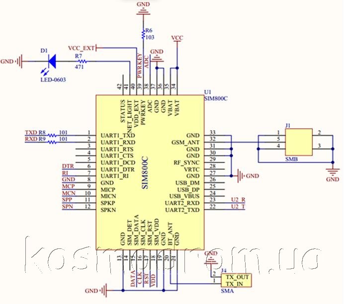 SMS сообщений, передачу данных по стандарту GPRS. SIM800C соединяется с
