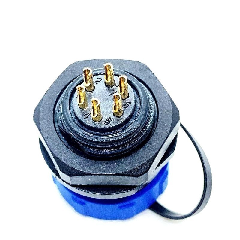 Фото может отличаться от реального вида предмета, но это не влияет на основные характеристики изделия | Круглые герметичные разъемы IP68 W17A2-06 SP17, гнездо, PIN:6, IP68, 500В, 10A, пайка на панель,с защитной крышкой
