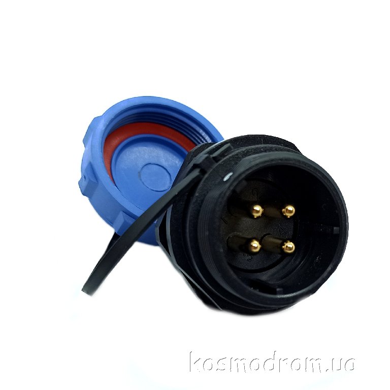 Фото может отличаться от реального вида предмета, но это не влияет на основные характеристики изделия | Круглые герметичные разъемы IP68 W21B2-04 SP21, вилка, PIN: 4, IP68, пайка на панель, 500В, с защитной крышкой