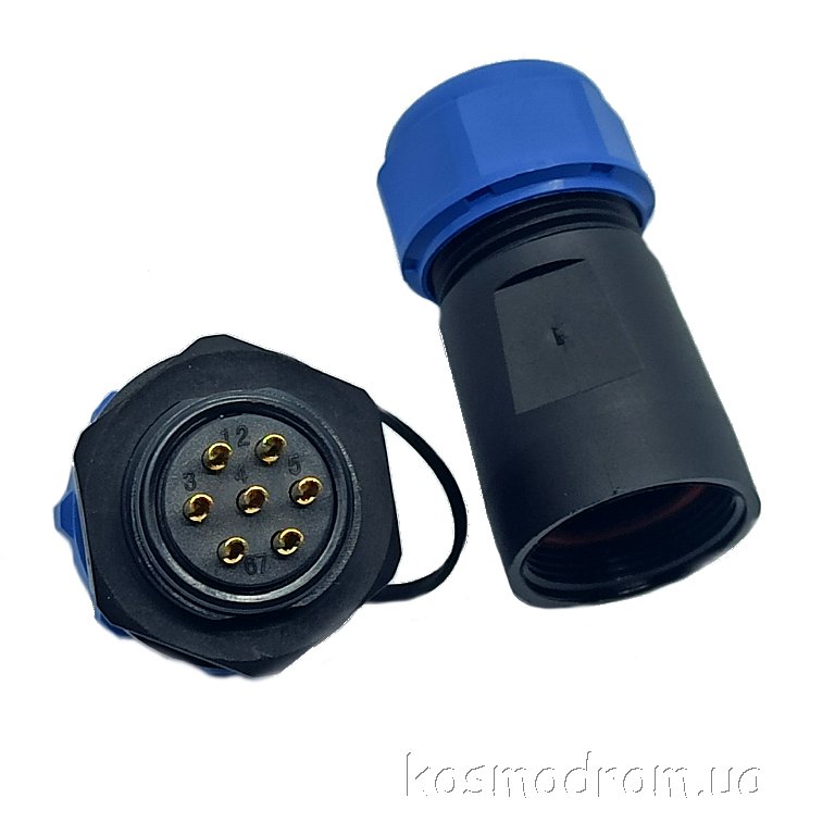 Фото может отличаться от реального вида предмета, но это не влияет на основные характеристики изделия | Круглые герметичные разъемы IP68 W21B4-07 SP21, вилка, PIN: 7, IP68, диаметр кабеля: 7...12мм, пайка, на провод, 500В с защитной крышкой