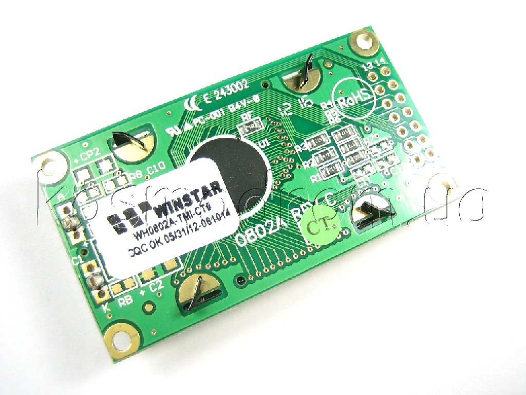 Фото может отличаться от реального вида предмета, но это не влияет на основные характеристики изделия | Жидко-кристаллическая матрица WH0802A-TMI-CT ЖКИ модуль: 8 символов 2 строки: Размеры 58.0x32.0 мм: Размер символов 2,96х5,56 мм, English/Cyrillic Font