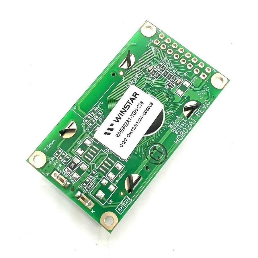 Фото может отличаться от реального вида предмета, но это не влияет на основные характеристики изделия | Жидко-кристаллическая матрица WH0802A1-YGH-CT Символьный ЖК-дисплей. (с курсором). размер 58x32 мм, видимая область 38х16 мм, размер символа 2.96x5.56 мм, контроллер ST7066, интерфейс 6800, питание логической части 5 В, LED, English/Cyrillic Font