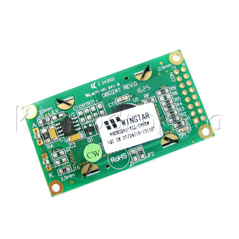Фото может отличаться от реального вида предмета, но это не влияет на основные характеристики изделия | Жидко-кристаллическая матрица VATN WH0802A1-YLL-CWVE ЖК-дисплей, VATN, 8 символов 2 строки, цвет подсветки: желтый, Интерфейс:6800 interface (ST7066 IC), размеры: 58х32 мм, Размер символов 2,96х5,56 мм, English/Cyrillic Font