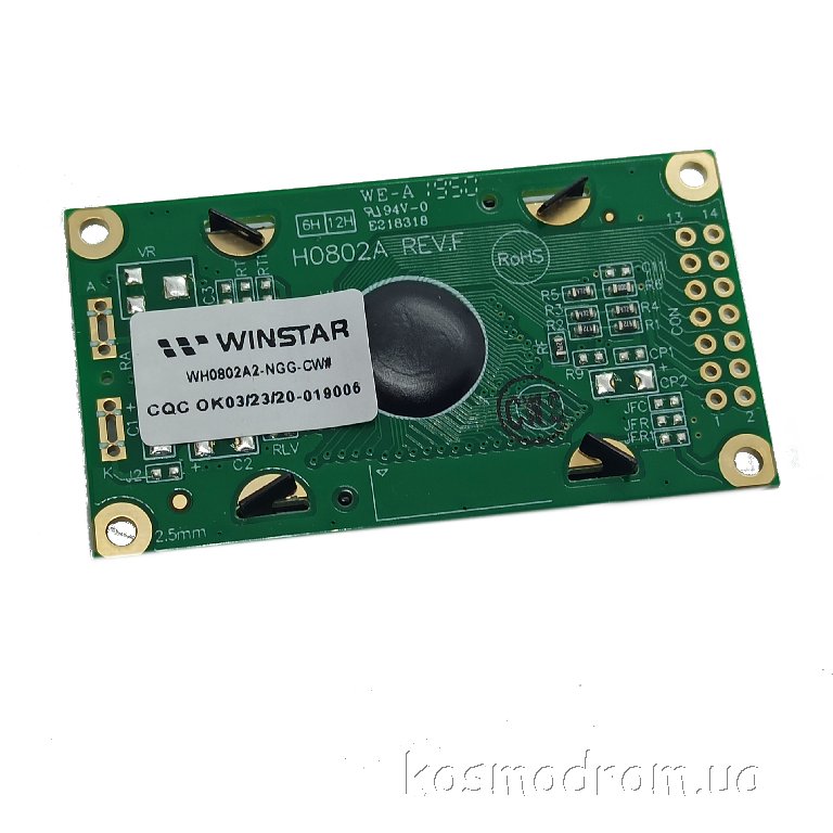 Фото может отличаться от реального вида предмета, но это не влияет на основные характеристики изделия | Жидко-кристаллическая матрица WH0802A2-NGG-CW-SPI Дисплей: символьный, Разрешение: 8х2, Размер: 58?32 мм, Интерфейс: SPI, English/Cyrillic Font