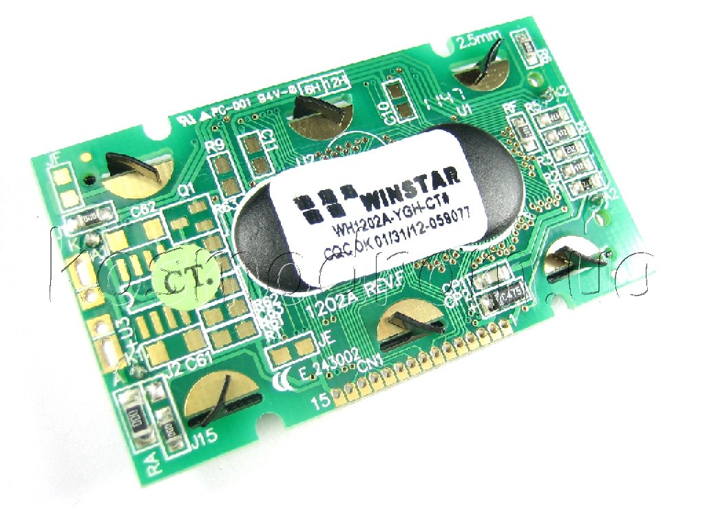Фото может отличаться от реального вида предмета, но это не влияет на основные характеристики изделия | Жидко-кристаллическая матрица WH1202A-YGH-CT STN Серый (позитив), TF, 6:00, Траб=-20…+70, LED Желт-Зелен, Eng/Cyr, NULL, Интерфейс: 6800 interface (ST7066 IC), Размер символов 2,65х5,50 мм, English/Cyrillic Font