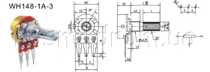 Potentiometer: shaft, single turn: 20kohm: 63mW: 6mm: ±20%: metal