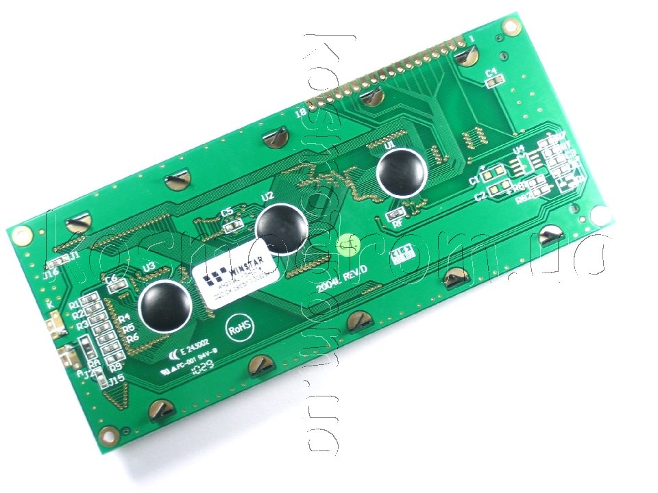 Фото может отличаться от реального вида предмета, но это не влияет на основные характеристики изделия | Жидко-кристаллическая матрица WH2004L-YGH-CT символьный - 20 символов x 4 строк. размеры модуля, мм: 146.0 x 62.5. размер видимой области, мм: 123.5 x 43.0 (диагональ: 5.1 = 13.1 см). Размер символа: 4,84х9,22 мм, English/Cyrillic Font