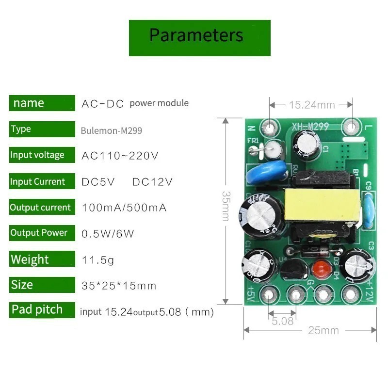 Входное напряжение — AC 110–220 В. Имеет два выхода: DC 5 В (100 мА, 0.5 Вт) и