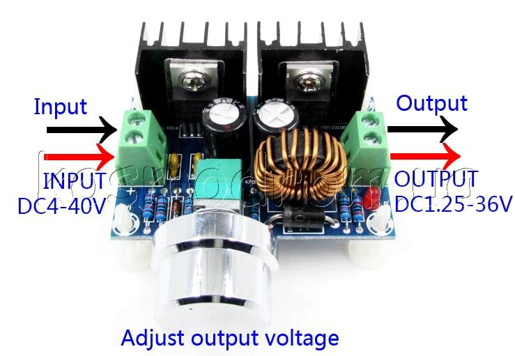 Регулятор напряжения с ШИМ на XL4016E1 Входное напряжение: DC 4-40 В Выходное напряжение: DC 1.25-36 В. Макс. мощность 200 Вт.