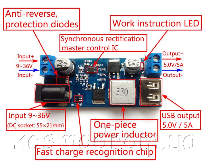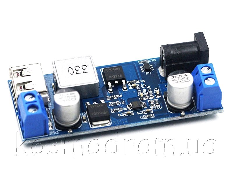 Понижающий DC/DC преобразователь с USB выходом. Uвых. 5,2 В. макс. кратковременный ток: до 5 А. Входное напряжение: 9...36 В.