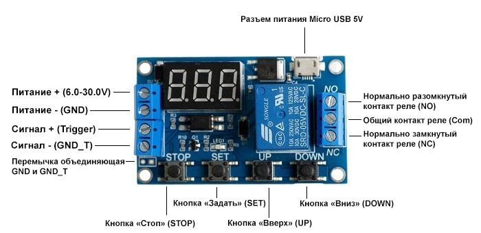 Подключение питания реле времени осуществляется через клеммы 6.0-20.0V и GND,
