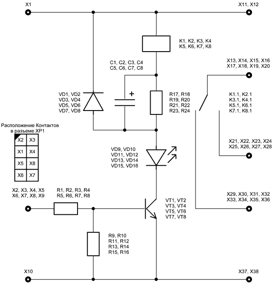 9. Выходы: восемь оптически изолированных симисторных двухамперных каскадов с возможностью подключения силовых симисторов для управления более мощными нагрузками (более 2 А).