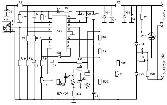 Набор позволяет собрать блок, который будет автоматически включать освещение при появлении в зоне его обнаружения движущихся предметов, и выключать его через заданное время. Время, на которое включается освещение, может регулироваться в пределах 5 минут. В состав блока входит также датчик освещенности, что позволяет настроить блок таким образом, что дополнительное освещение включается только при недостатке естественного освещения. Блок выполнен на базе современного инфракрасного пассивного датчика движения, используемого в охранных системах.