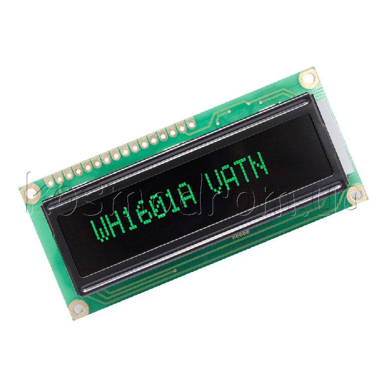 | WH1601A-GLL-CWVE Жидко-кристаллическая матрица VATN ЖК-дисплей, VATN, 16 символов 1 строка, цвет подсветки: зеленый, Интерфейс: 6800 interface (ST7066 IC), размеры: 80х36 мм, Размер символов 3,07х6,56 мм, English/Cyrillic Font