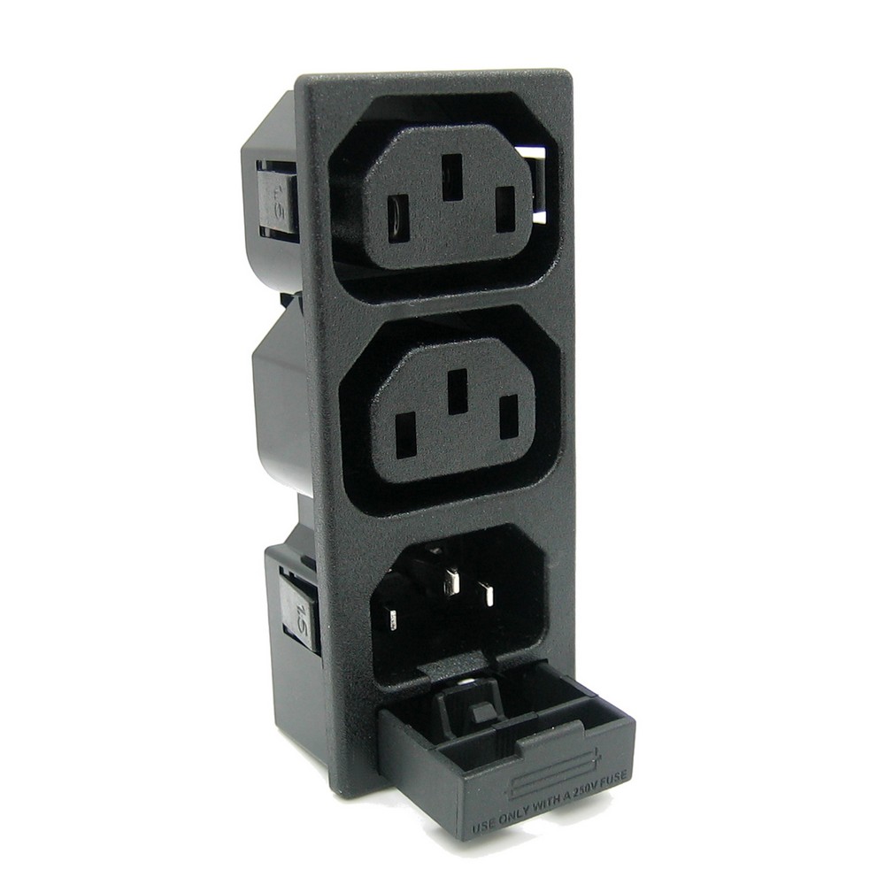 | AS-402-3P Разъем питания 220v Разъем IEC 320 C13+C14. 220В. вилка/розетка, на блок, 3 контакта, крепление защелка. Количество секций вилка: 1 Количество секций розетка: 2. С отсеком для предохранителя