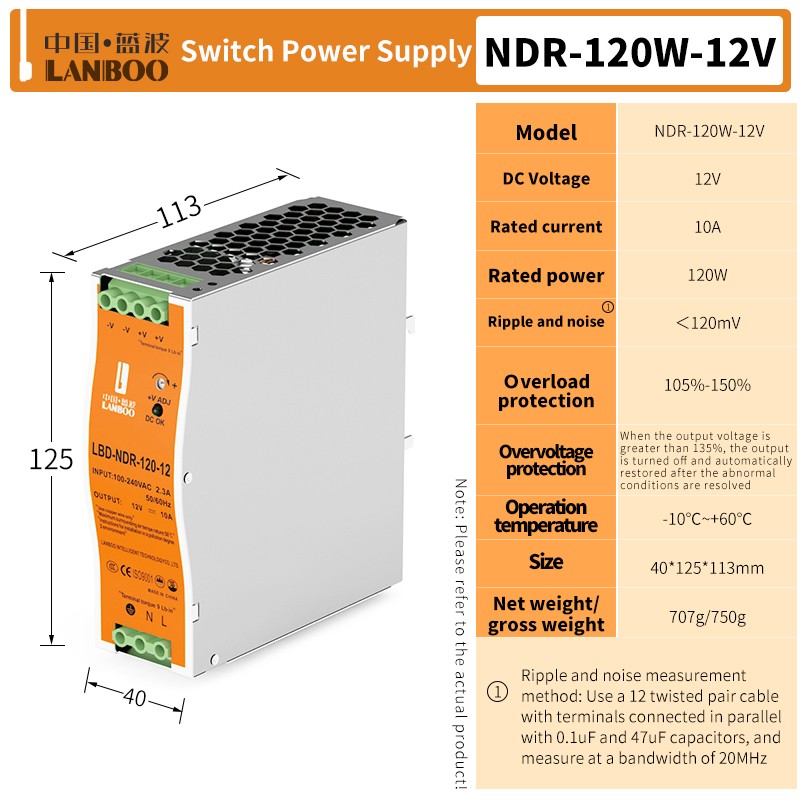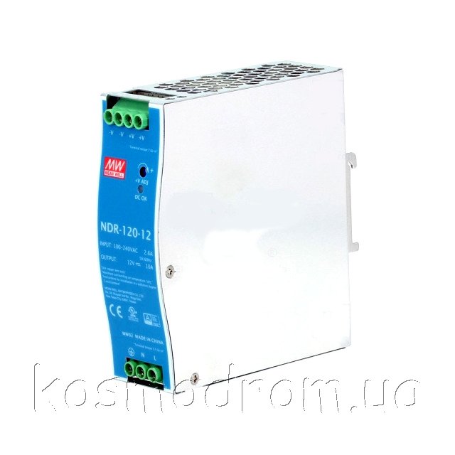 AC/DC,на DIN рейку 120W, Вход: 90-264VAC/127-370VDC, Выходное напряжение 12В,10A, размеры 40х125.2х113.5 мм, -20...+70 С, количество выходов 1