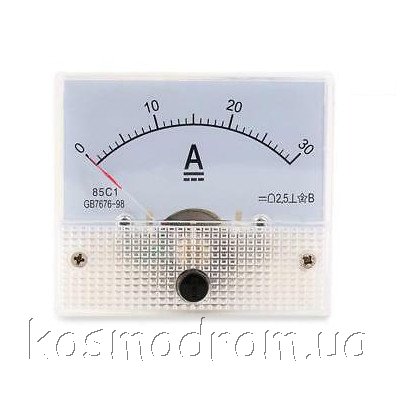 | AM-30A Амперметр 85C1. Амперметр аналоговый, диапазон измерения: 0...30 A постоянного тока. Размеры: 63х54х58 мм. Шунт встроен