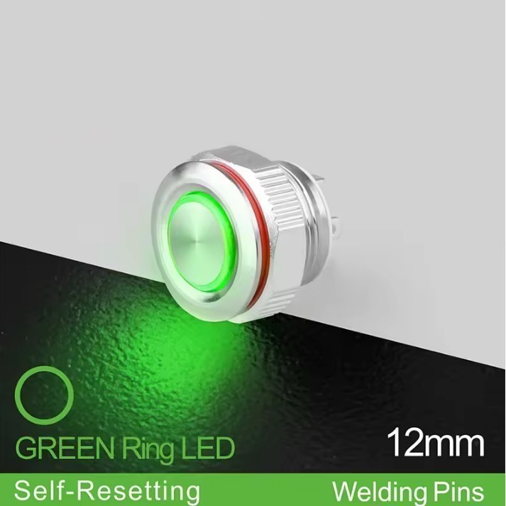 LB12E-P10F-EG5-24V-N Кнопка антивандальная круглая, 12 мм, плоская, нормально открытая, без фиксации, круговая LED, GREEN, 5-24V, латунь никелированная, MAX: 7A/250VAC